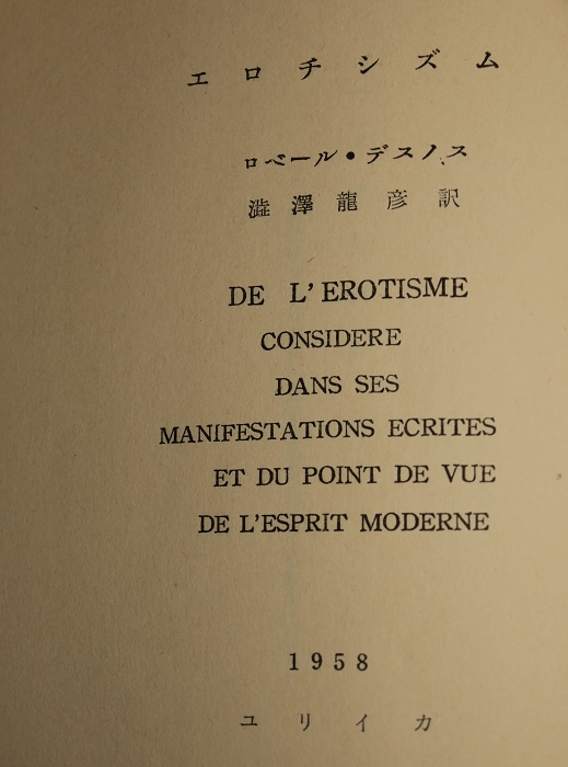 二十世紀フランスで活躍した詩人、ロベール・デスノスによる名作「エロチシズム」は、原題は「近代精神の見地から文学作品から考察されたエロティシズムにつて」という長いタイトルだ。1958年書肆ユリイカにより澁澤龍彦の翻訳で極小部数刊行された。