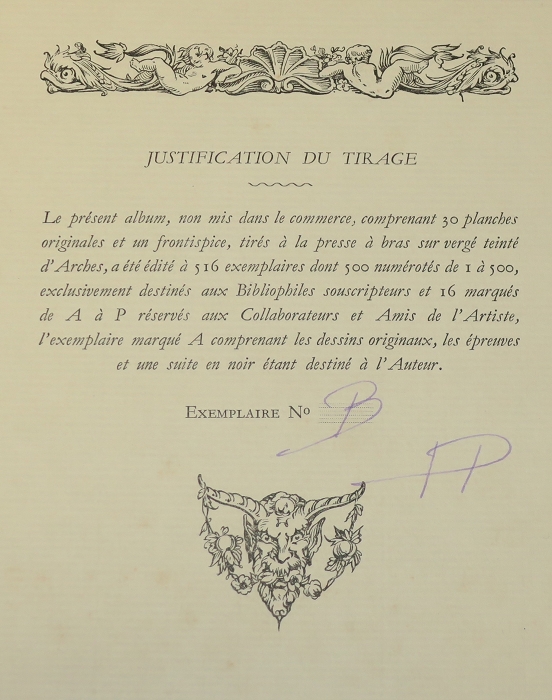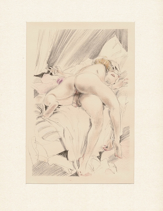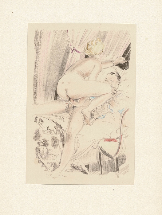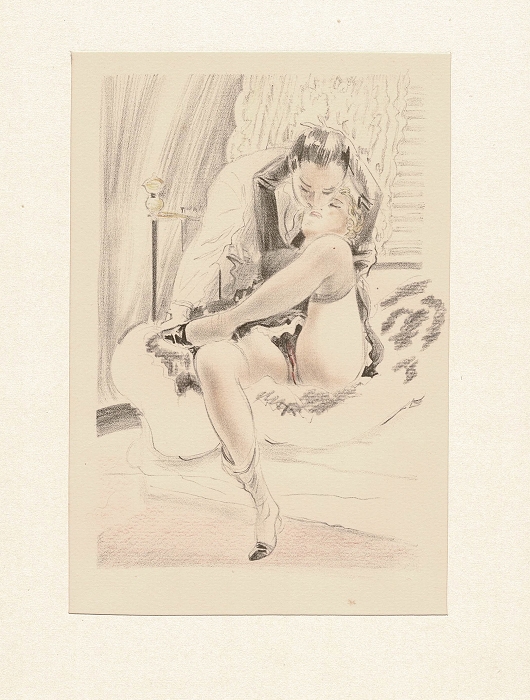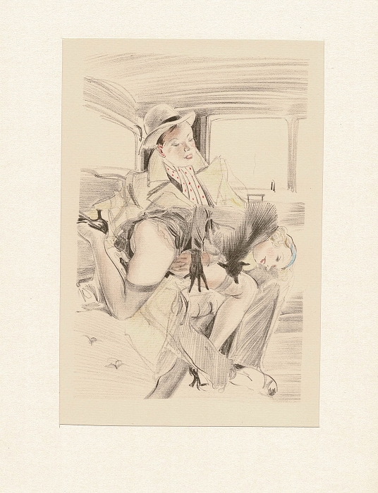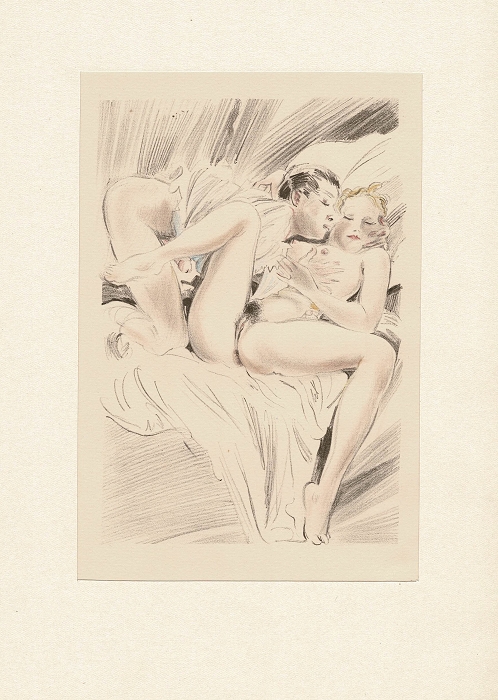 PREMIER TIRAGE DE CE RECUEIL COMPOSÉ DE 31 LITHOGRAPHIES ORIGINALES COLORIÉES À LA MAIN ET MONTÉES SOUS PASSEPARTOUT, DONT UN FRONTISPICE, LITHOGRAPHIÉES PAR FEDOR ROJANKOWSKI. DUTEL EXPLIQUE: “APRES UNE RENCONTRE DANS LE METRO, UN COUPLE ENTAME UN FLIRT TRÈS POUSSÉ DANS LE TAXI QUI L EMMÈNE DANS UN HOTEL OU LES NOUVEAUX AMANTS POURRONT ENFIN SAVOURER PLEINEMENT LEUR INTIMITÉ.