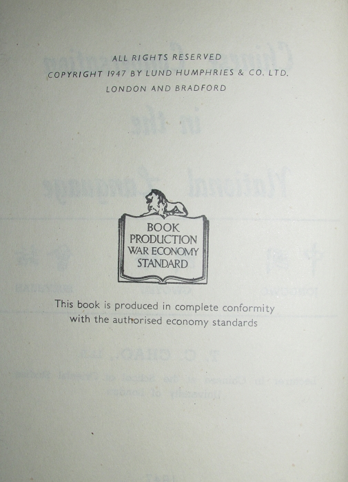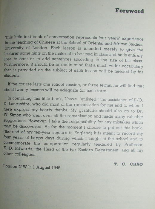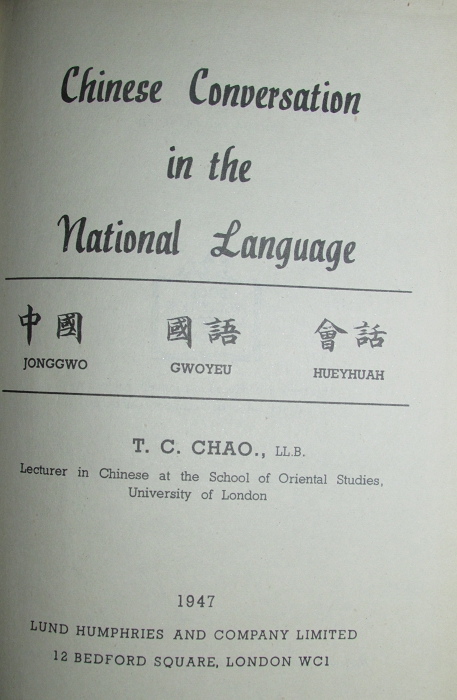 此书50年代以后多次增订重印,初版初印本罕见。T.C.CHAO履历不详,仅知是博士。很有意思的一本书,中英双语加旧式拼音,覆盖了生活中的各个场景。民国时的中国话和现在不太一样,保留了传统中文最后的雅致和教养。