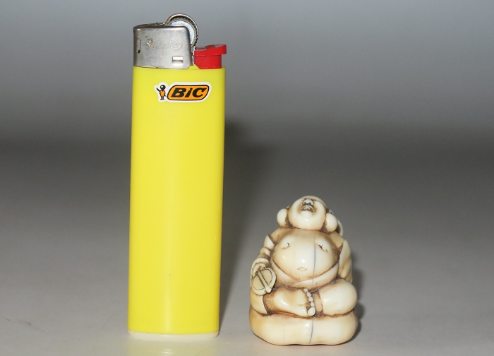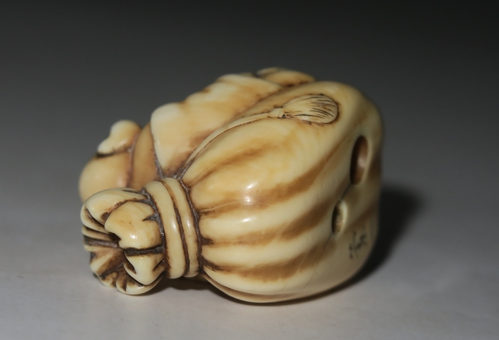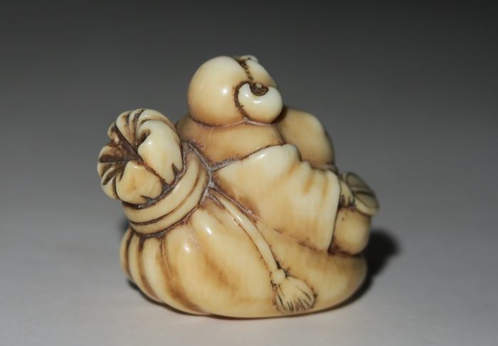 19世纪中期兰一牙雕,构图和雕刻已经达到巅峰。兰一存世作品多为动物,人物仅有国立东京博物馆“乡爵士旧藏”。这是已知兰一第二件牙雕人物,也是唯一的布袋题材。方寸间将佛生女相和布袋的洒脱刻画栩栩如生,充分展现了立体的八面美感。