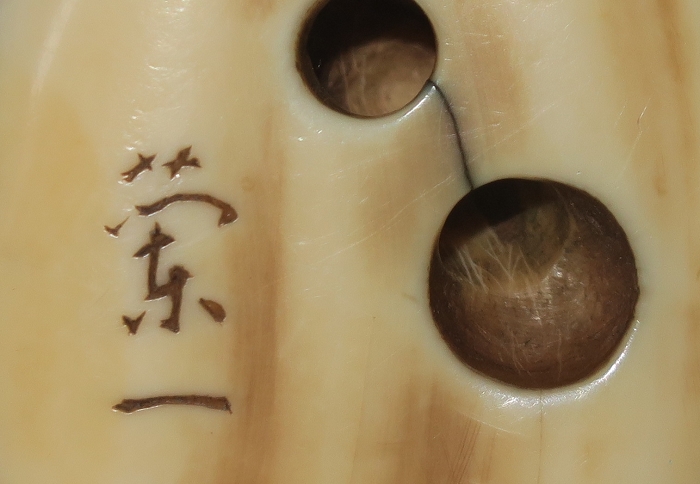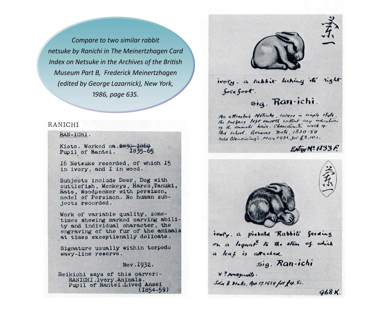 Excellent quality carving, perfectly captured mood of the scene, wonderful face with horn eyes, anatomically correct view from the bottom. Himotoshi is formed by  bottom.  beautiful warm yellow patina, old age lines. Signed RANICHI in leaf shaped reserve on the bottom. this brilliant carver is discussed in detail on p. 860 of NETSUKE & INRO ARTISTS AND HOW TO READ THEIR SIGNATURES by George Lazarnick.