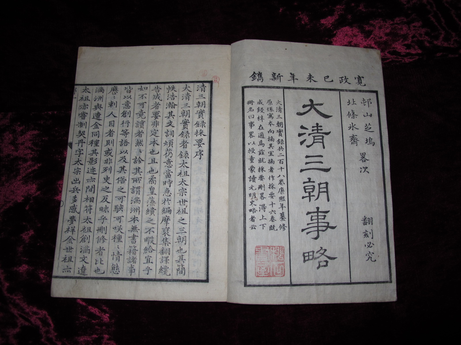 前有筑前国原任儒学侍读邨山纬撰清三朝实录采要序;末有宽政己未春正月邨山喜慎识跋。版权页题“宽政十一年春正月刊。清朝实录采要十六卷近刻。江户书肆千钟房。须原茂屋兵卫发兑”。封底原藏者贴纸墨笔题识:“津藩硕学津阪东阳旧藏”。