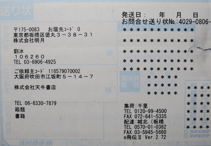 天牛用合作的快递发书,价格便宜到只要300日元,可惜速度还不如邮局的平邮。收到的书的感觉,包装精美,华而不实,几乎没有防护措施。品相存在严重文字游戏,很难想象这是关西第一书店的作风。以前完全不是这样,可以确定换了掌门人。