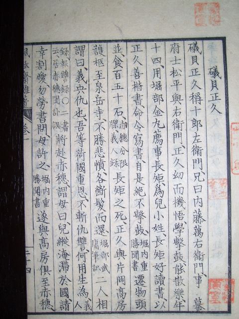 前有甲子(天保五年,1824)之冬水户藤田彪序并书;文政已丑(十二年,1825)秋九月青山延光叙,弟延昌书;另附珮弦斋杂著目录,除本书外,尚有刀剑录、名花有声画、南狩野史、三藩事略四种,皆罕遇难求,无从可考。末有藤田彪跋及嘉永辛亥(四年,1851)五月中浣立轩佐藤榥撰并书跋。