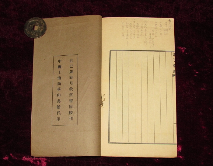 老子道德真经即王注老子:上下卷一册全,扉页题老子王弼注,卷端题老子道德真经,魏王弼注,唐陆德明音义,日本宇恵考订(宇佐美惠灊水),1929年文求堂田中庆太郎上海铅字排印本。版权页题“己巳(昭和四年,1929)岁春月救堂书屋校刊,中国上海商务印书馆代印”。