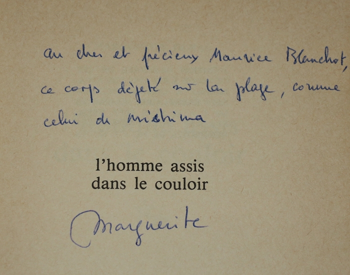 诗写的很是有水平,几乎无法翻译。硬着头皮直译:“致亲爱和宝贝的Maurice Blanchot,这具搁置在沙滩的尸体,就像三岛(由纪夫)。雏菊(=玛格丽特·DS)”。《坐在走廊里的男人》的女人,结局究竟是死是活一直有争议。法语尸体和身体都是一个词,如果没有三岛由纪夫,依然无法判断死活。现在可以确定女人死了,因此这部色情作品的沉重螺旋状上升,因此这珍贵的手迹已无法用金钱衡量价值。