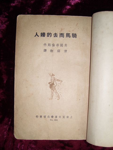 骑马而去的妇人:一册250页全,劳伦斯著,唐锡如译,良友图书公司民国25年10月12日初版初印1500册,丛书编号442,实价5角。32开(18×12cm)报纸本,书脊上下有伤,书品清爽。