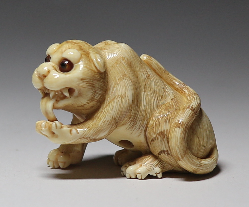 18世纪初,京都派冈友雕刻虎成功,从此成为专利,至今无人能够超越。20世纪初开始,木雕和牙雕的日本虎根付成为欧美博物馆的镇馆之宝,尤其是牙雕,几乎是日本根付或者“日本微型象牙雕刻艺术品”的代名词。自古没有虎的日本,以虎的题材著名世界,这事很讽刺。