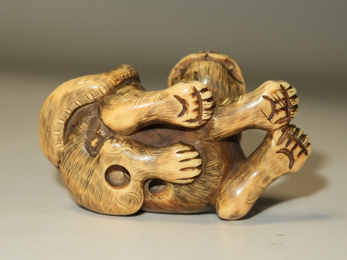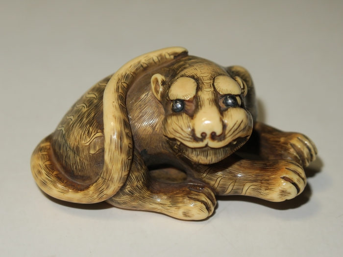 有著录的世界最大的牙雕虎根付。大英博物馆和卢浮宫的藏品只有4厘米,都只能称之为“虎”,只有这只堪称“大虎”。