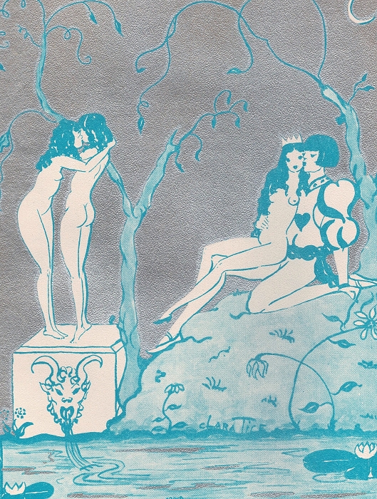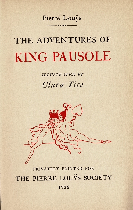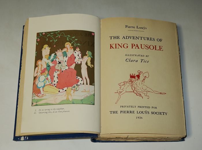 In-4(24×16.5cm),327pp. 1926 Private Printed for The PIerre Louys Society. Limited Editon of 990 copies, 930 numbered for sale; this is number 824. Color illustrations by Clara Tice. NOT ex-library. Hardcover has blue cloth-covered boards with gold spine and cover lettering and decorations. Deckle fore and bottom edges. Red and black title page. Ten multi-colored plates, including frontispiece.10 colour plates by Clara Tice.