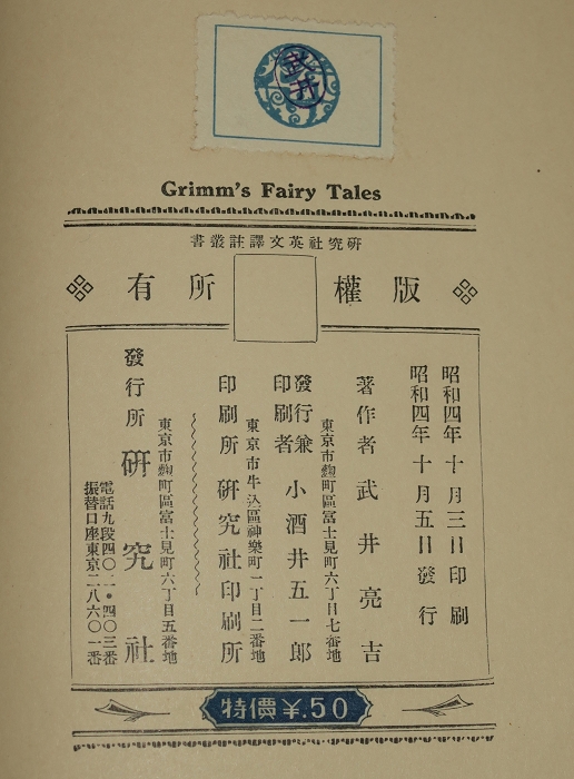 昭和四(1929)年武井亮吉发表了日本最初的日英双语对照版格林童话,武井本虽非全译本,但译文流畅准确,迄今依然是阅读格林童话及学习英语的最佳教科书。