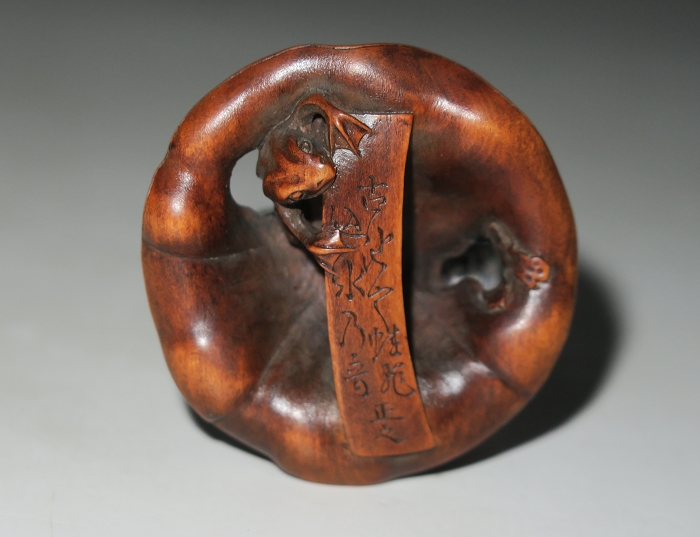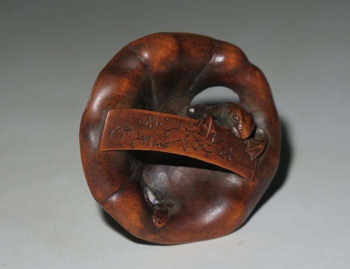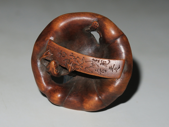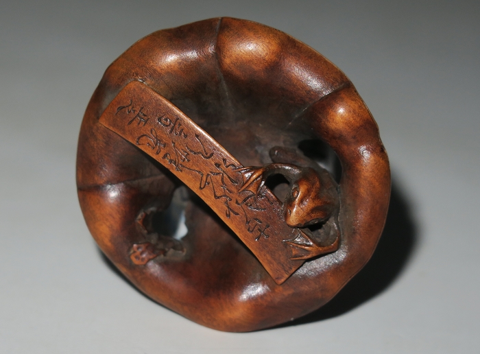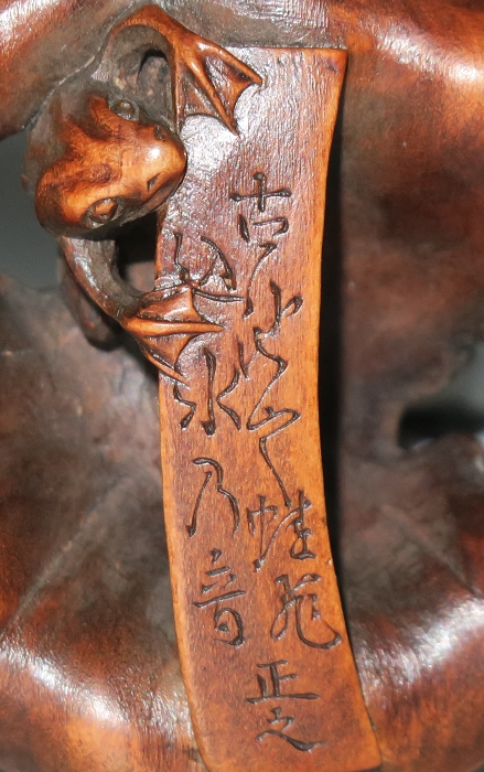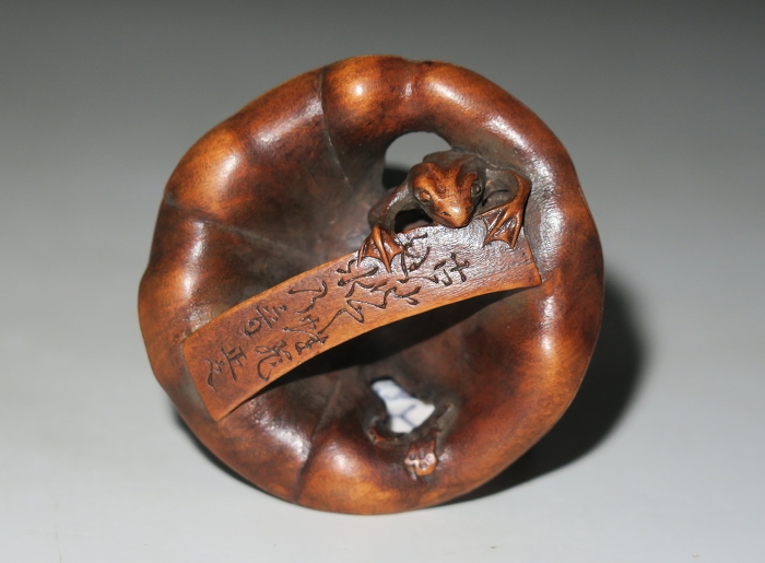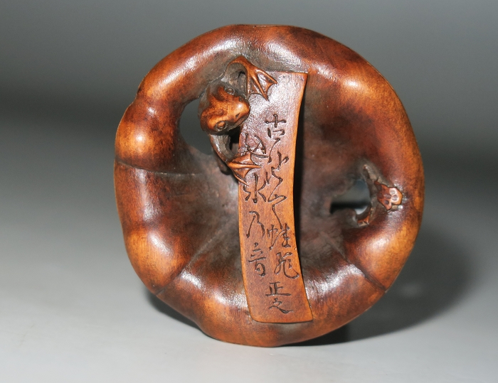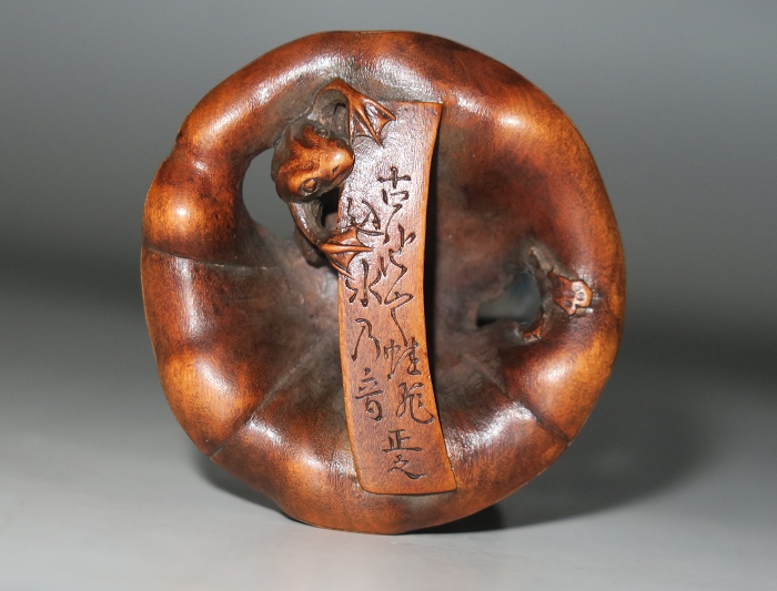 古池や蛙飛込水乃音 清水三年坂美术馆镇馆重器,黄杨木雕正之蛙咏纳入刘府。美术馆最终没有出售藏品,还是村山馆长以个人名义出让的。脸皮之厚已经达到境界,我自叹不如。 此件为正之代表作,蛙戏莲叶刻画栩栩如生,呼之欲出,名气之大不亚于鬼斧神工阴刻的松尾芭蕉俳句。 古池や蛙飛込水乃音(ふるいけやかわづとびこむみずのおと),日本人都认识,都能看懂,意思很简单,青蛙噗通跳入古井,翻译很难。 周作人和钱稻孙都译过,相对而言,钱译韵味好过周译,但距离原文还差一点火候。有机会争取试一下,看看能否完美了。 投稿者: 明珠 明月在天,清辉满地 明珠 の投稿をすべて表示