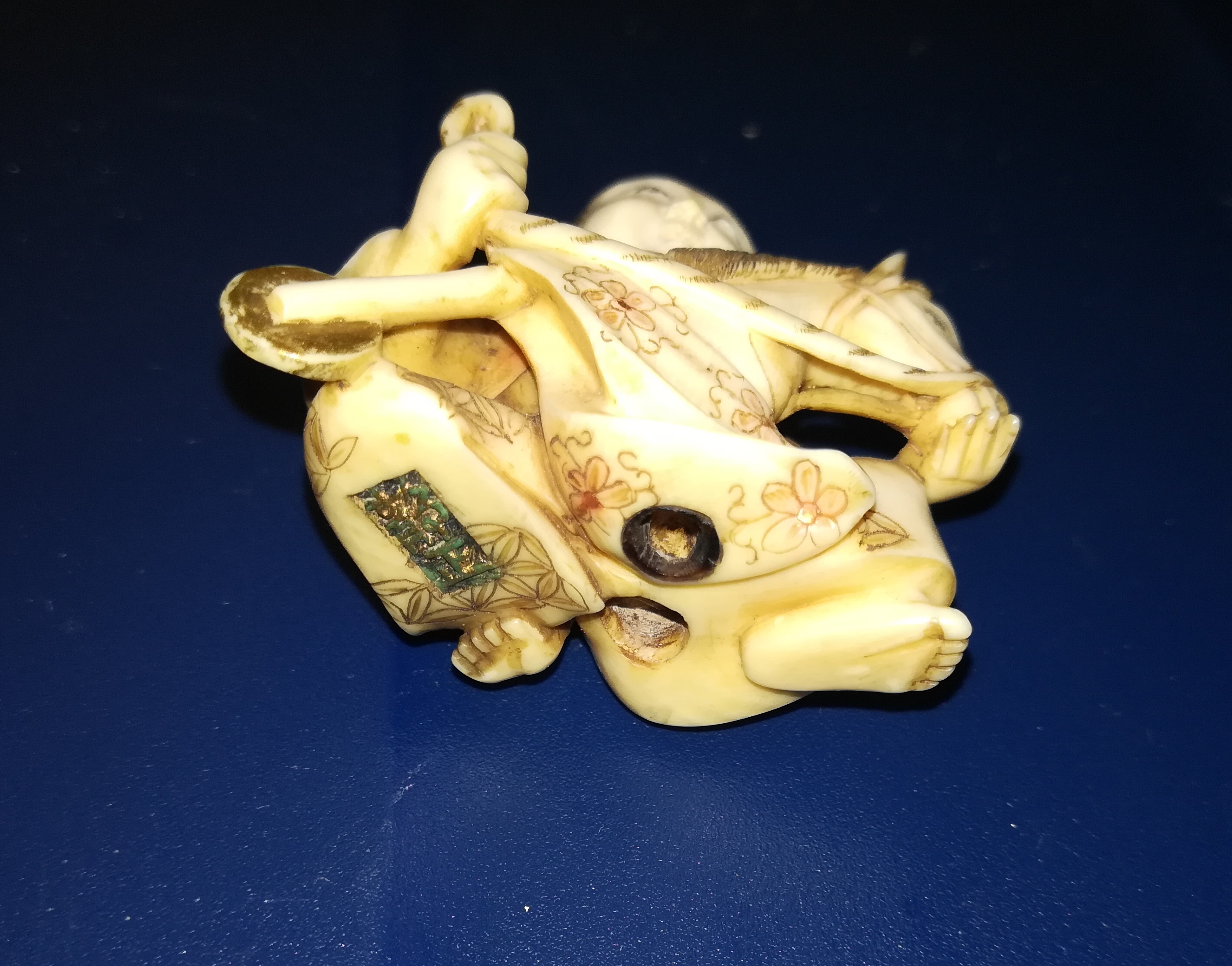 红梅竹马 0.2毫米不到的樱桃小口里清晰刻了起码18颗牙,堪称奇工绝妙。 海象牙硬度大于象牙,金莳绘贵于莳绘,绳孔以虬角(海象牙别称)增强旨在延长实用寿命。事实证明,雕成这样还真能用,少了一个虬角圈就是证明。 作者静正暂时查不到履历,推测是皇室僧人。此件作品大概完成于明治末大正初,标准的大正浪漫,昙花一现。 投稿者: 明珠 明月在天,清辉满地 明珠 の投稿をすべて表示