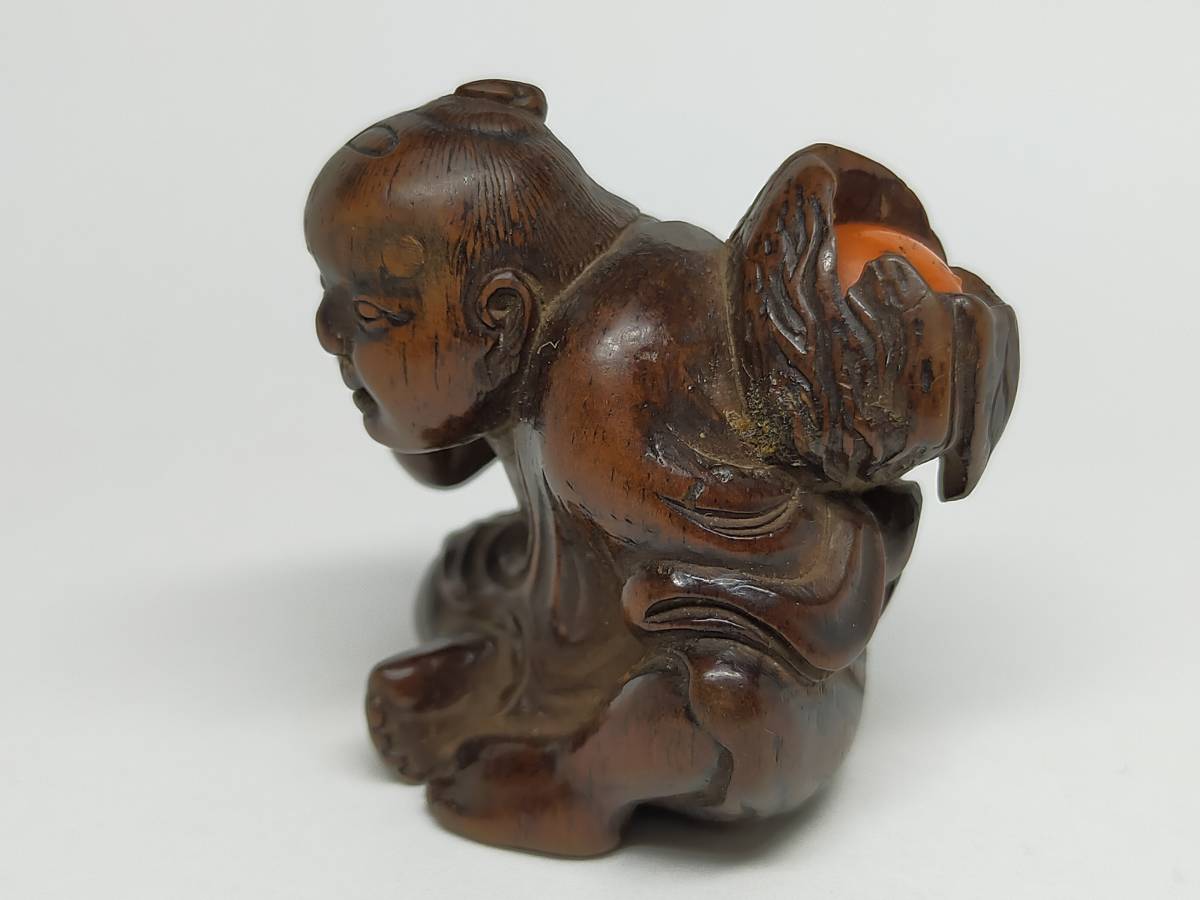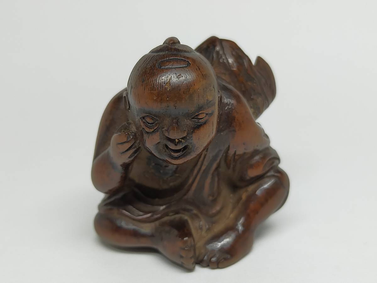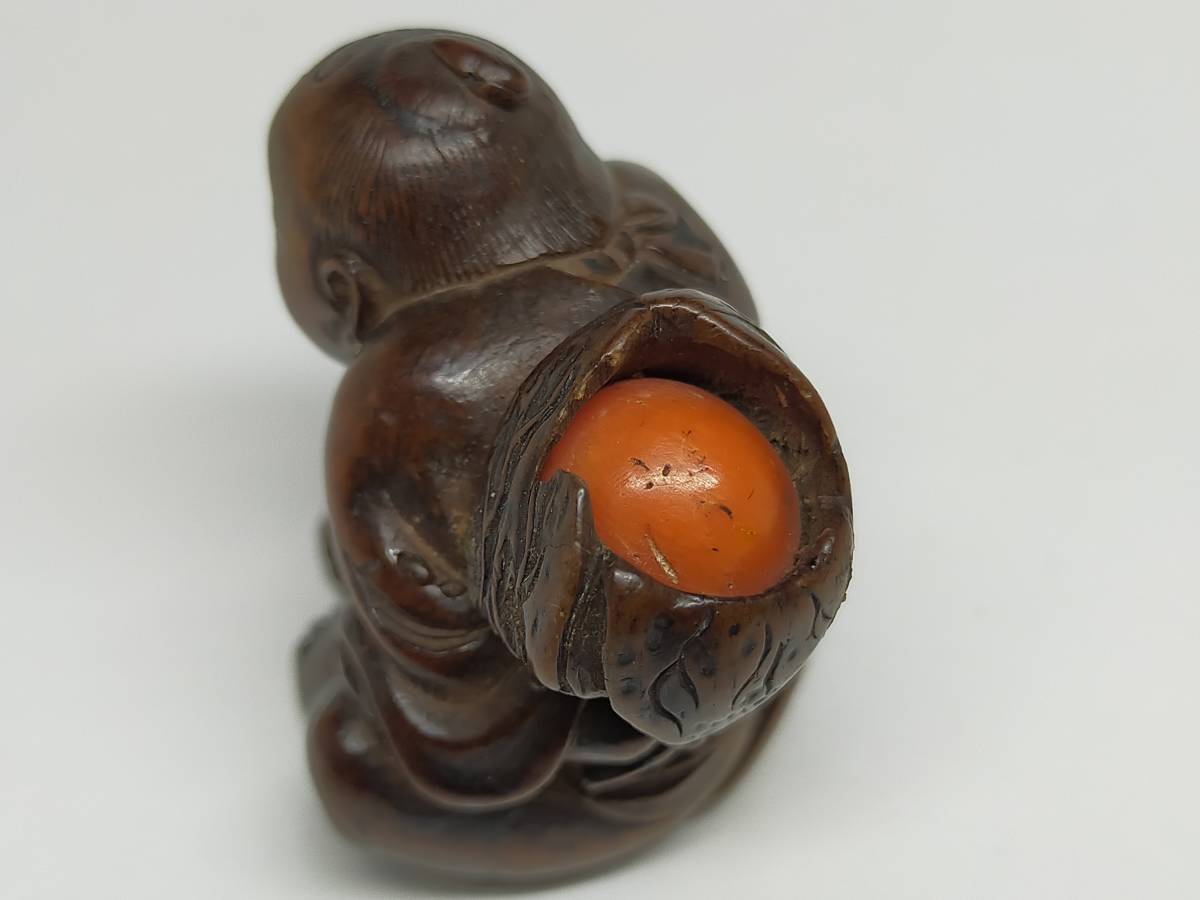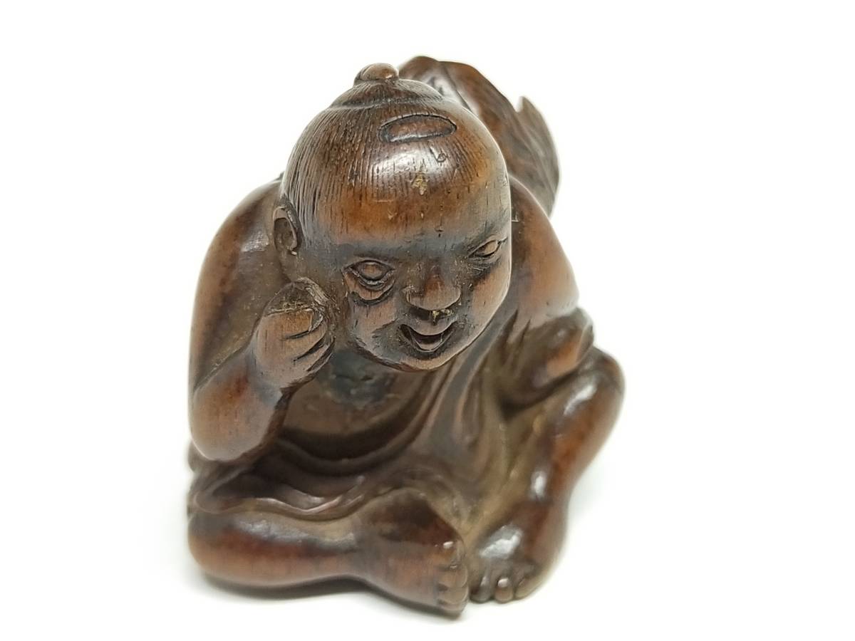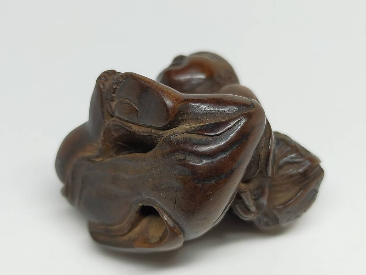 欧美各大博物馆的根付展,每次必有鸟江斋的蛙,日本反而默默无闻。今次从神户寄来的这只大雨蛙总算破冰了。蛙科品种繁多,雨蛙最难刻,因为浑身光滑无疙瘩。19世纪初的断代没问题,双重镶嵌的魄力也没问题,错在“鳥”上。正确答案是“乌江斋”。
