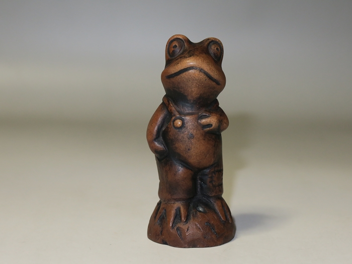 イギリスで購入したとても面白い蛙人形。立って意気揚々或いは不機嫌な顔をしている珍しいタイプ。石か練物か案外に判断不可能なので、材質不明。状態もなれもとても良好。恐らく30年代製と愚見。