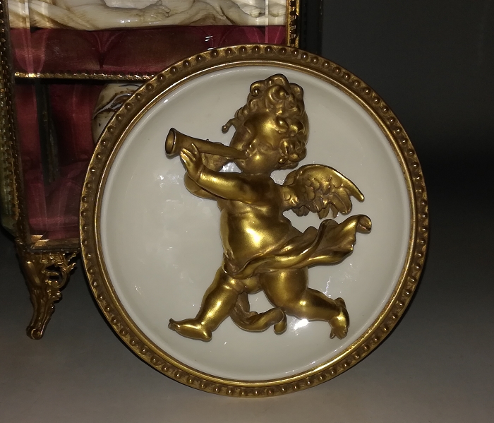 なかなか出ないとても素敵な壁飾りトレー。サイズも丁度よい。大変綺麗なレリーフ天使が装飾されている。20世紀中期頃の典型的なアールヌーヴォーデザイン。肉厚浮雕ならではの重圧感もたっぷり。作家署名入、状態良好。