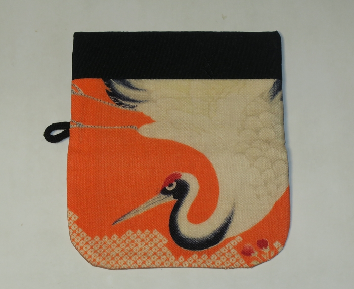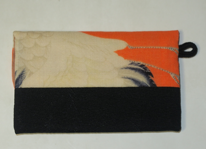 橙地に桜や暈しの綺麗な鶴など粋な味わいの柄。モスリンと黒紋綸子の時代物着物地で作ったカードケース。接着芯入りですので程よい硬さで、ポケットに入れても滑りにくくフィット。海外旅行などの際のちょっとした小銭入れとしても便利。小型のデジカメケースとしても御利用可能。