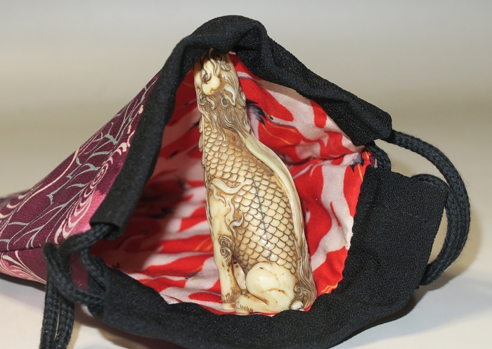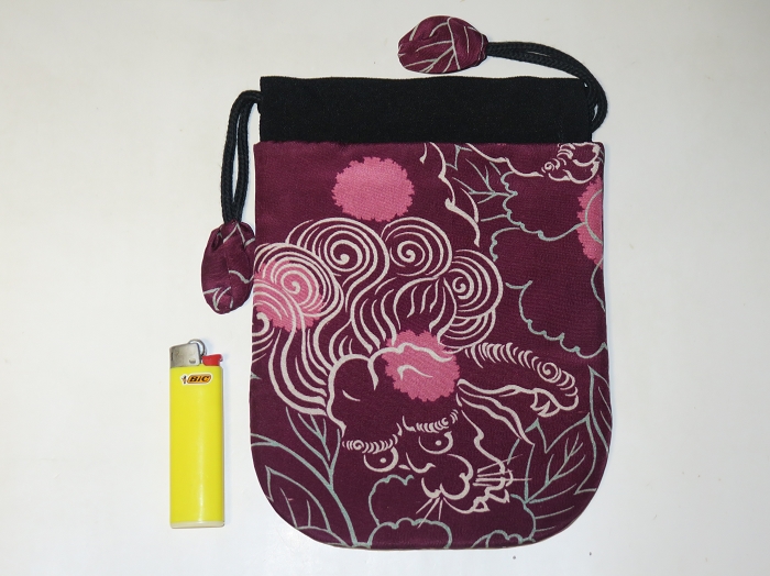 长崎和服师藤本秀子作品。古锦取自上等和服,里外双面工,结实美观。深红色背景上饰有古典狮子图案,威风凛凛,霸气十足。布芯柔软蓬松,放入取出方便。保护贵重物品如酒器、手把件的不二之选。取材难得,威武霸气高雅的杰作,最适合豪爽男性使用。