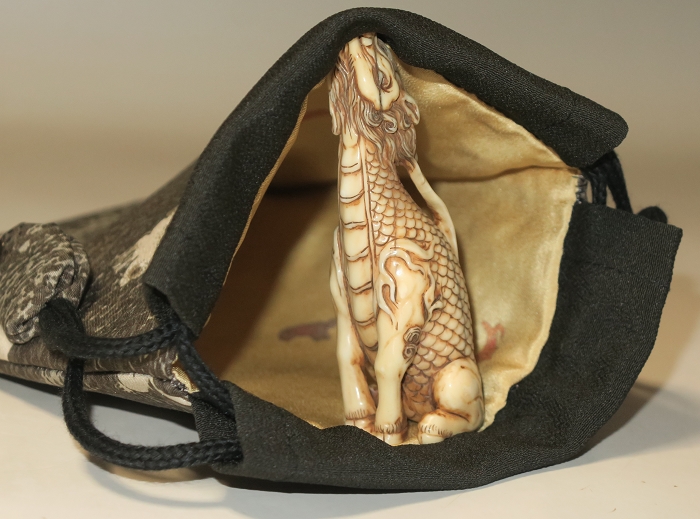 长崎和服师藤本秀子作品。古锦取自上等和服,里外双面工,结实美观。灰褐色背景上刺绣装饰竹林、野兔和羽扇的罕见图案。布芯柔软蓬松,放入取出方便。保护贵重物品如酒器、手把件的不二之选,这种题材的和服贵重稀少,取材十分难得,最受欢迎的图案,莫失良机。