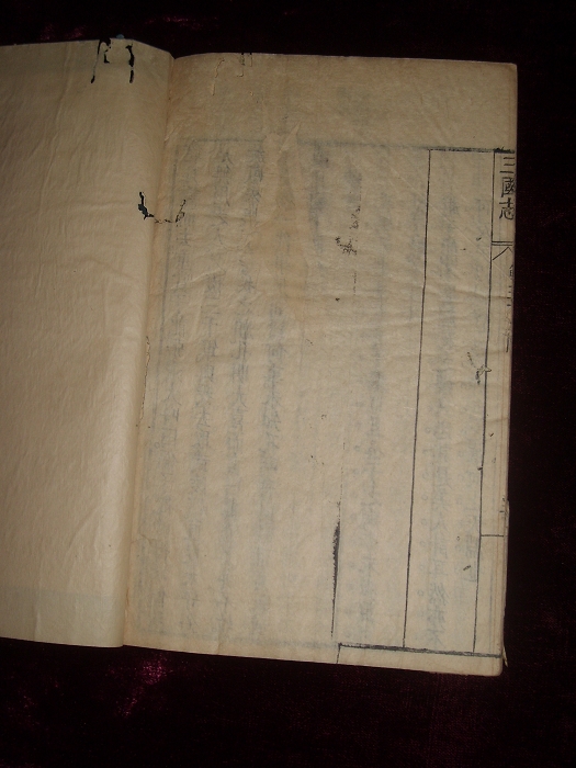 书长25×16.1cm,半框20.6×14cm,10行22字,无界,四周单边,白口单白鱼。版心上题“三国志”,中记回目、叶数。闽纸(又名白竹纸),瘦体字,典型万历风格,无补版,不避清讳。2册合计183叶366面,连函厚约3厘米,美浓纸染蓝靛封面,书品清爽,轻微虫蛀,余好,状态上佳。