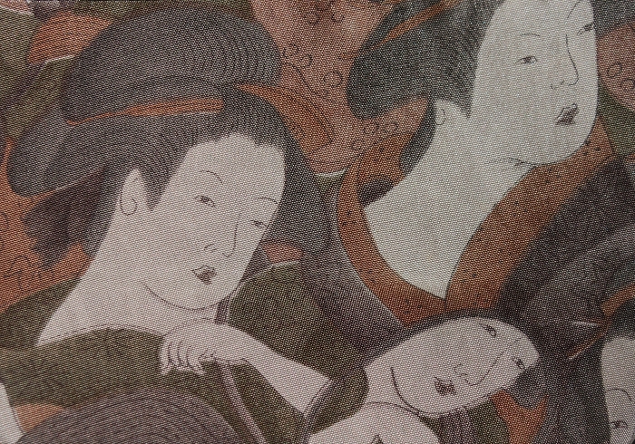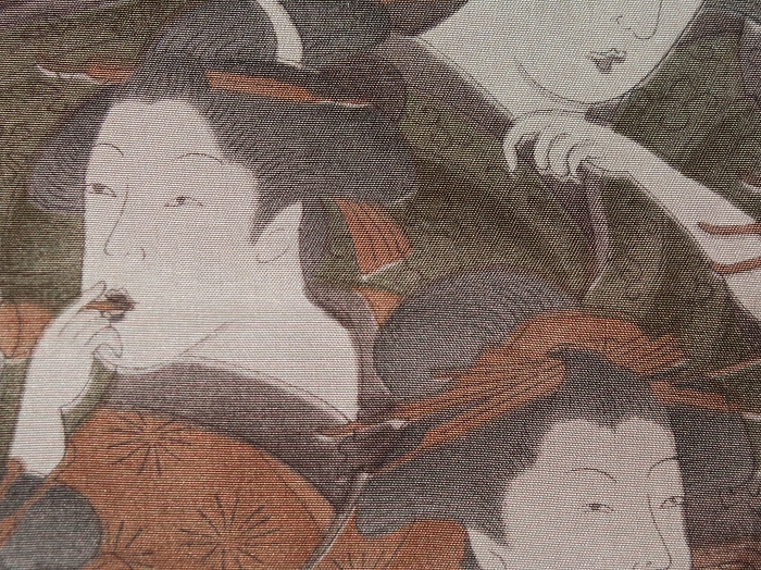 长崎和服师藤本秀子作品。古锦取自上等和服,里外双面工,结实美观。五彩缤纷的背景上刺绣扎头发的少妇,念经的老板娘,装饰钗钏挂的艺伎,极为罕见的浮世绘题材,宛如江户时代女性众生相。