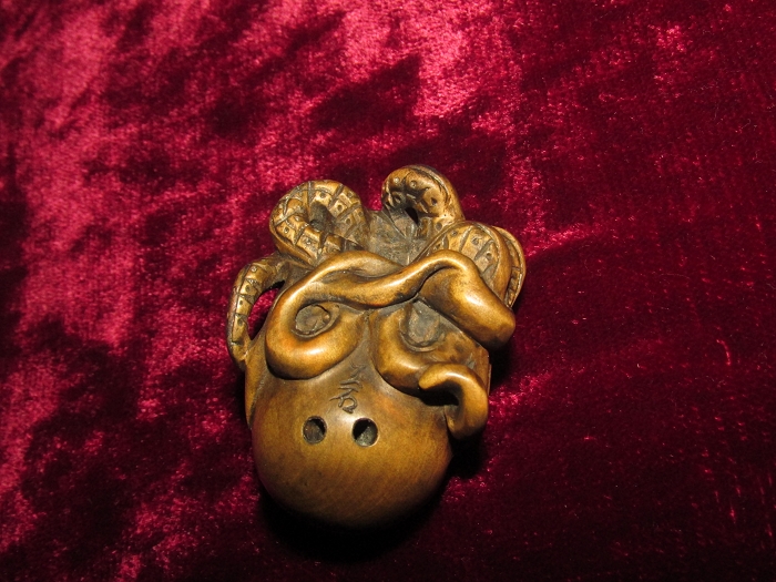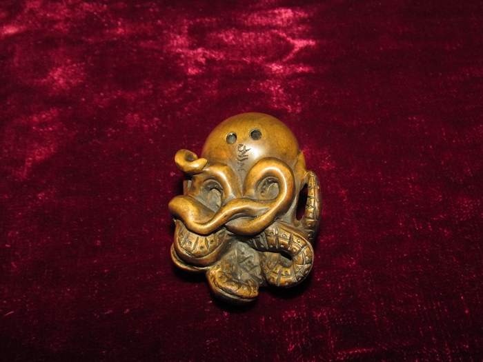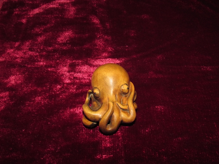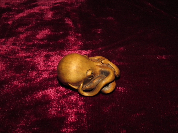 柔らかい素材なので、軟体系のタコを美しく彫り込んでいる。使用感のある光沢が、タコのぬらりとした質感とマッチして、良い味を出る。全くの左右対称ではなく、それぞれに表情があるところが、手彫りの良さ。裏側の脚部分も細かく吸盤等の彫り込みがあり、根付特有の紐通し部分も付く。
