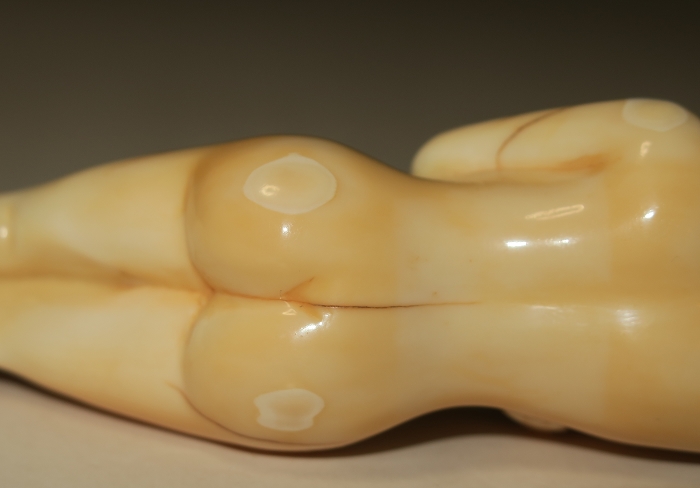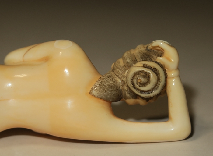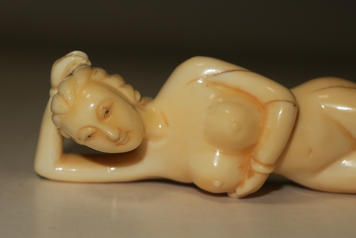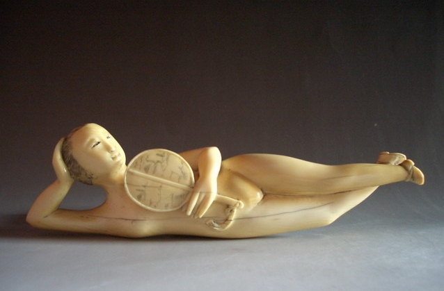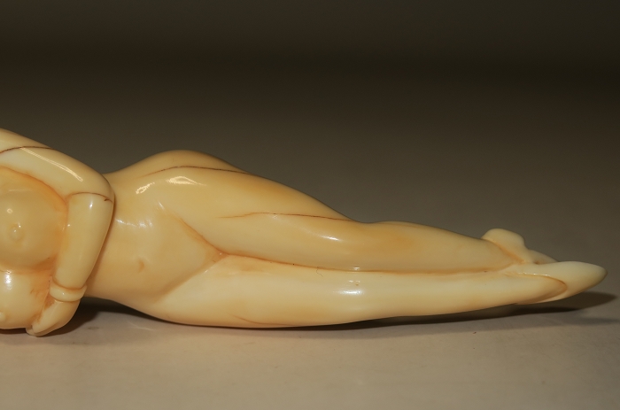 存世最早的牙雕裸女卧像可追朔至明末,此类作品最大共同点在于手指细长,小巧玲珑(约10至15cm),裸体。胸部皆有遮挡(手或团扇),不暴露生殖器。最重要的一点,明清作品不穿鞋,也不露脚。对于中国人而言,缠足是最典型的色情象征。因此脚既不能太大,也不能穿鞋,大约在19 世纪末20 世纪初,为迎合欧美审美观念,方才出现穿鞋作品。