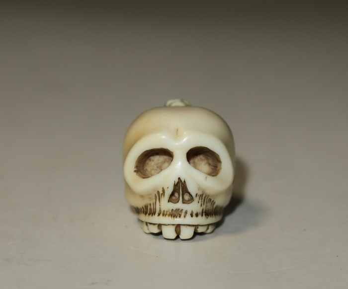 無銘か現代作家にもかかわらず最高傑作のスケルトンを彫りこんだ牙彫根付。河鍋暁斎の野晒し髑髏画に代表される和の髑髏。カエルが髑髏に乗せた珍しいデザイン。手で握れる細工の彫刻美術品。細部まで手抜かりなく作り込まれた、気品溢れ、愛嬌のある見事な意匠を完成させている。長年を使うことによって、色の変化を楽しめる逸品。