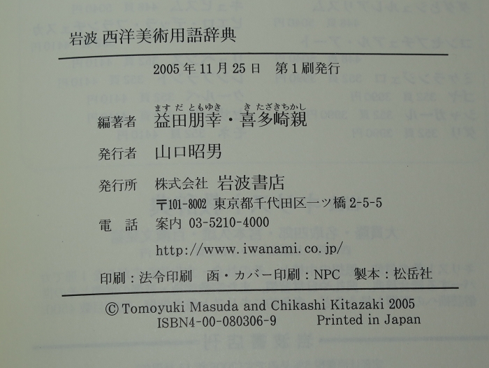 典型岩波书店的权威性辞典,书小内容大,包含2000个日语标题以及包括英语和法语在内的欧文索引,几乎是浓缩版的西方艺术百科全书。