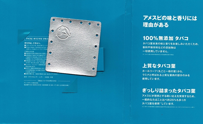 アメスピ由于没有任何添加剂,每根烟塞满的都是货真价实的原生态烟草,所以这个广告并没有任何夸大。逐渐占领小众化市场后,アメスピ又推出了纸卷专用烟叶,专供怀旧使用。
