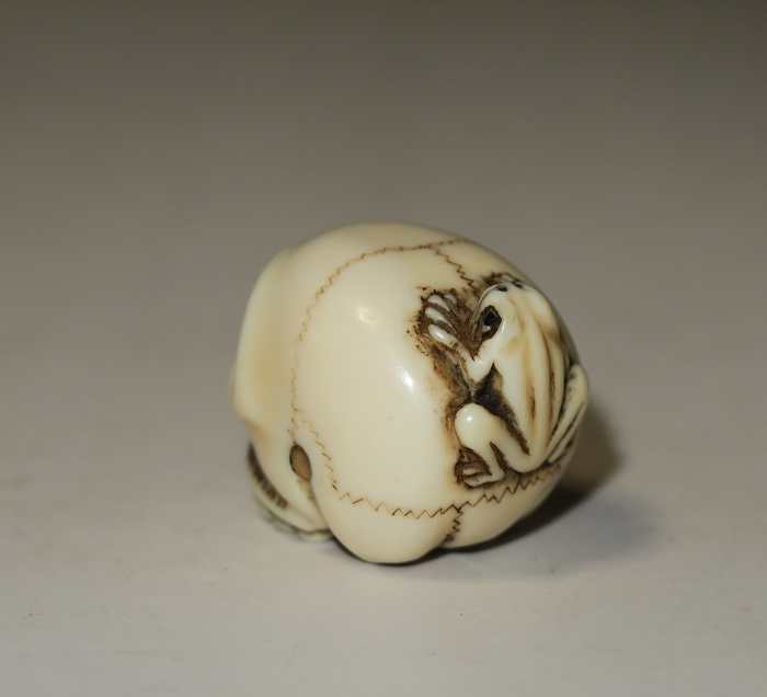 The Japanese word frog and Safety are homophonic (kaeru), and usually frogs are mascots that represent beauty. In this whimsical idea, the frog represented by the mascot is placed on the skull that symbolizes death, implying that all things are impermanent, and the prosperous must decline. The Diamond Sutra says: “All conditioned dharmas are like dreams and bubbles, like dew and electricity, and should be viewed as such.” have the same meaning. A hundred years of life is fleeting. Fame and wealth are like fleeting clouds, dreams and illusions, and immortality is nothing but an urn.