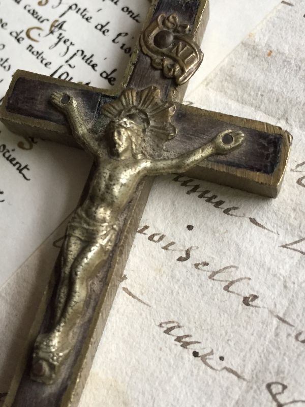 19世紀後半のフランス製。クラシックかつトラディッショナルなデザインのタッセル。どっしりと重く重厚かつ細かい細工の深い信仰心を感じる真鍮製十字架。当時広まり始めたアルミホイルとメタリック糸の重厚なタッセルがついている。1800年前後のマニュスクリと1900年前後の美しいマリア様のホーリーカードをお付け。