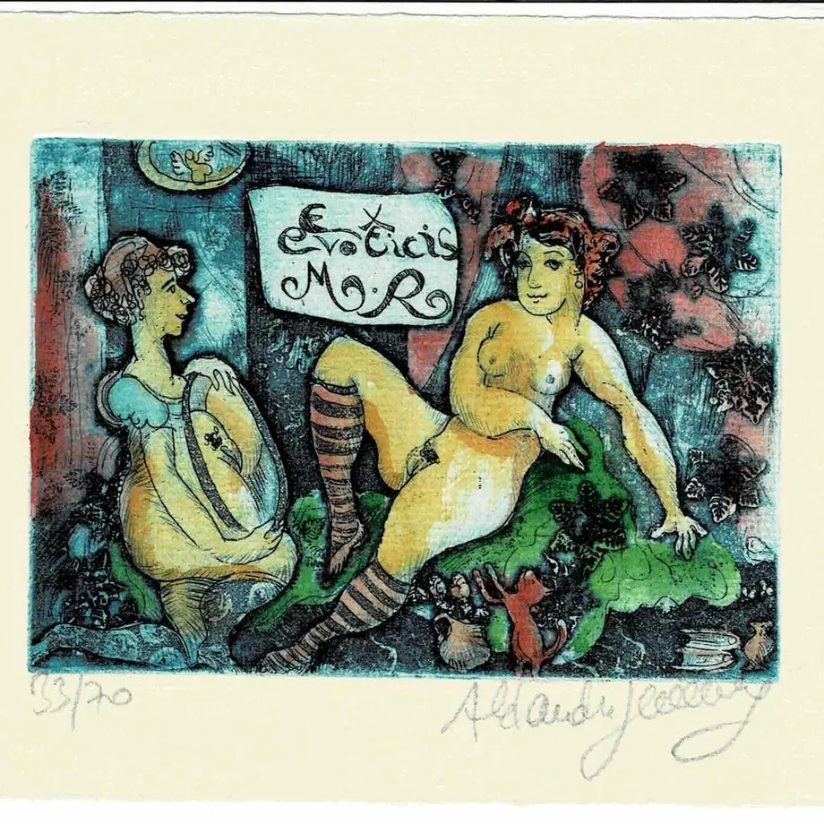 已故日本藏书票第一人小枝昭一氏旧藏,交换票(画家间互相交换的非卖品)。赫尔伯格(Hellberg)作为60岁以下相对而言比较年轻的女画家,平生以仅创作蚀刻色情铜版画藏书票而著称于世。