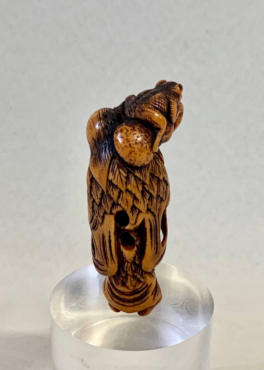Old man from China.this carved is in the form of a Daoist sennin, dressed in a robe and cape of mugwort leaves, There are two cord holes in his back. Gama sennin standing, smiling as he holds a gourd flask over his shoulder. carved wearing long open robes, holding a gourd spray with a toad seated on his shoulder.