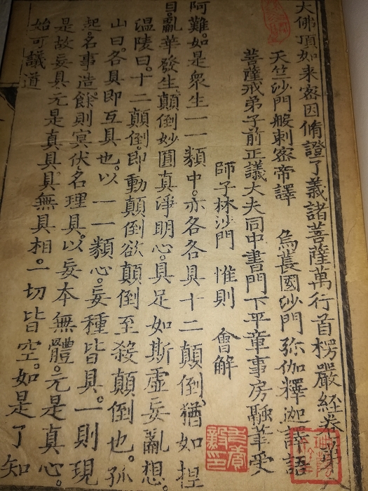 楞严经会解卷八,金镶玉装,11行21字,上下细黑口单黑鱼,左右双边,无界。版心內题“会解,卷目”,下记叶数。上等麻纸,写刻精绝,典型元末闽刻风格。原函,绫面,洒金笺,藏印“木堂藏书”、“犬养毅印”等多枚。